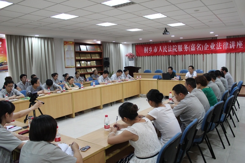 7月27日(周六)下昼 ,应公司约请 ,桐乡市人民法院走进利来国际公司为企业提供执法服务 ,在公司行政楼三楼多功效厅 ,举行了一次执法专题讲座。公司向导、营销中心各部分全体职员 ,财务治理部、信用治理部、票鹄胛理部、采购物控部、经编事业部的营销、生产、财务认真人等30余人加入了聚会。
